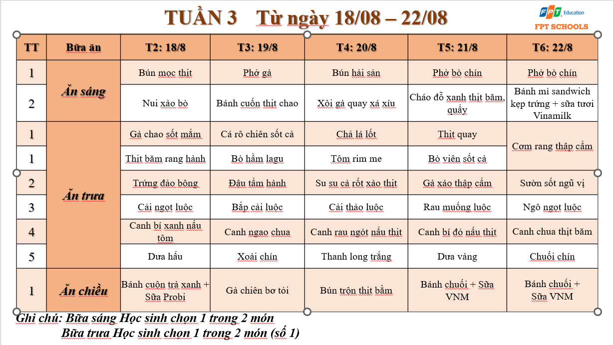 Mời quý phụ huynh cùng các con tham khảo Thực đơn tháng 08/2025 của khối THCS, Trường Tiểu học & THCS FPT Cầu Giấy.